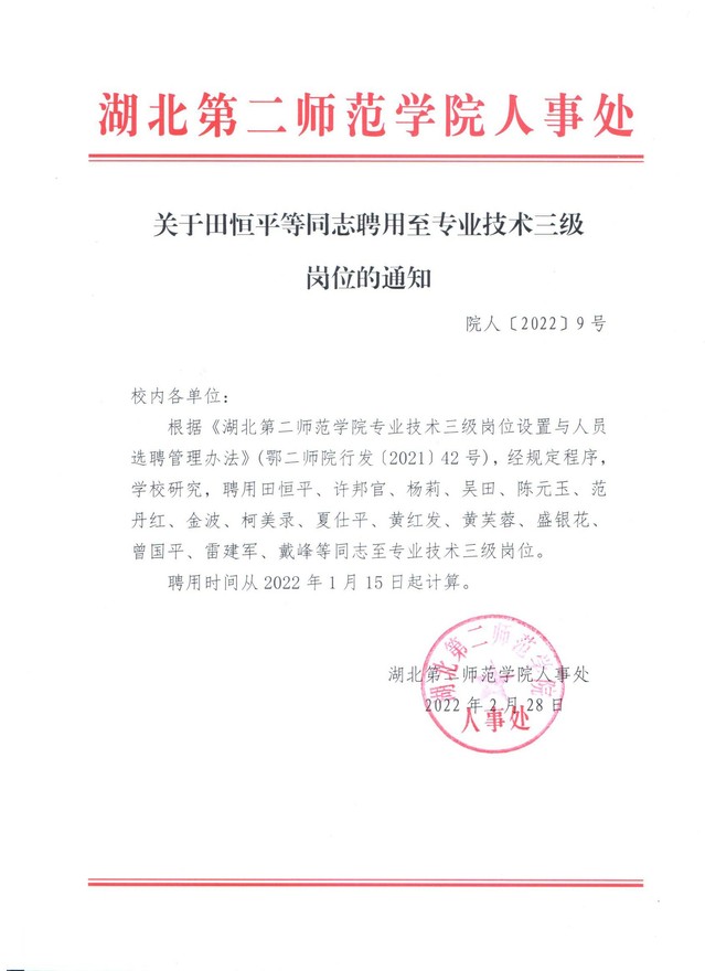 关于田恒平等同志聘用至专业技术三级岗位的通知