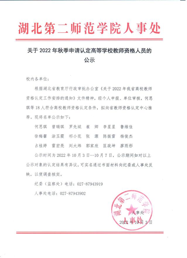 关于2022年秋季申请认定高等学校教师资格人员的公示