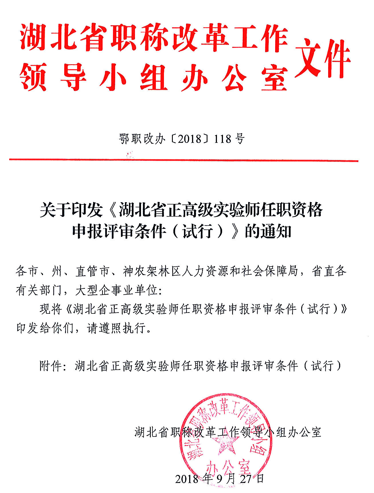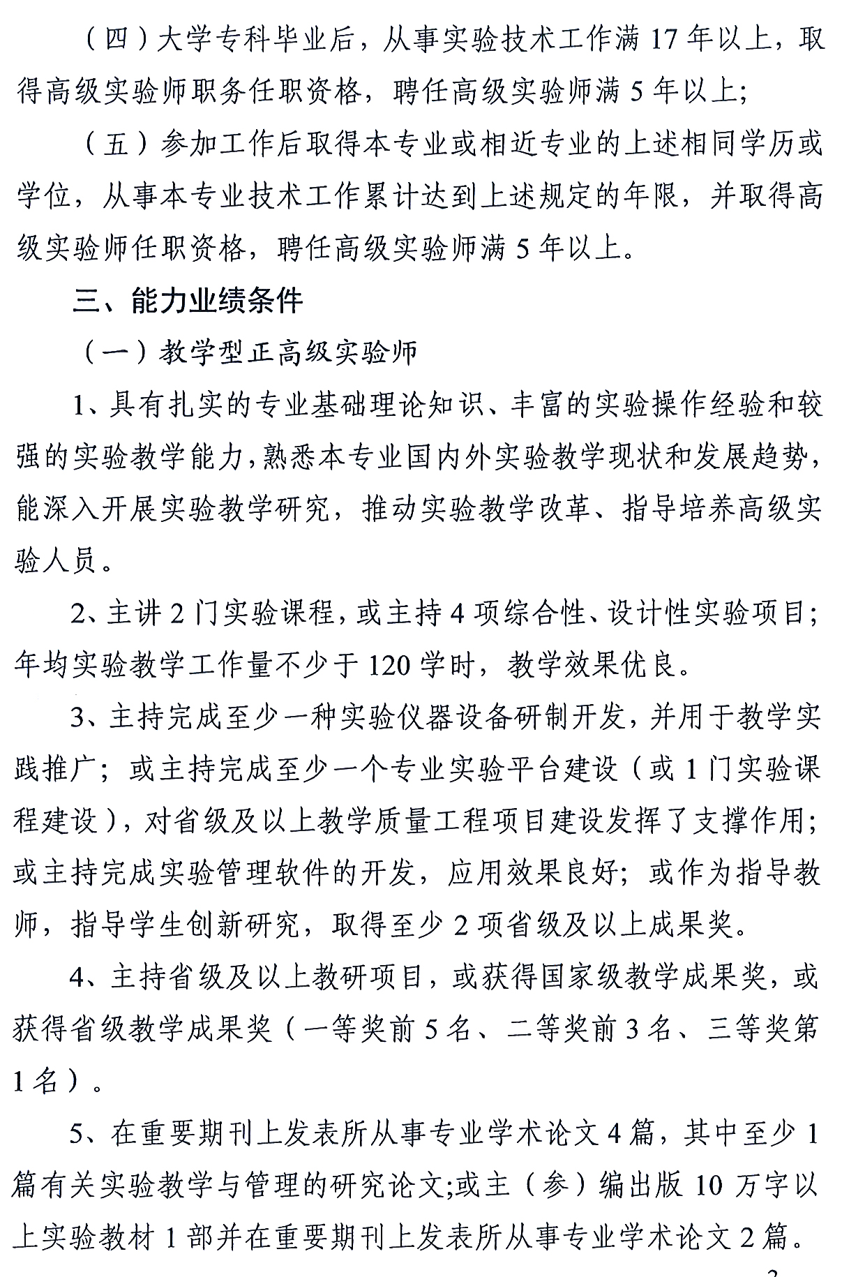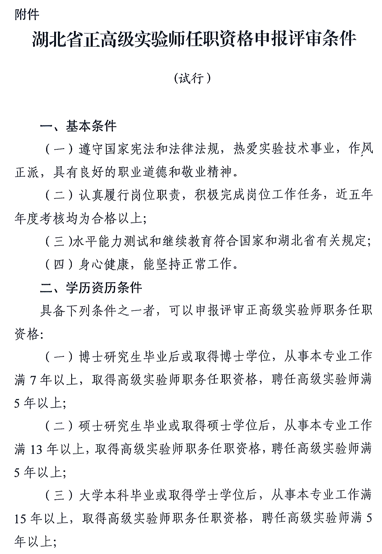 4、大学专科(两年制)毕业后,从事实验技术工作13年以上,大学专科(三年制)毕业后,从事实验技术工作12年以上,取得实验师职务任职资格,并从事实验师职务工作5年以上;