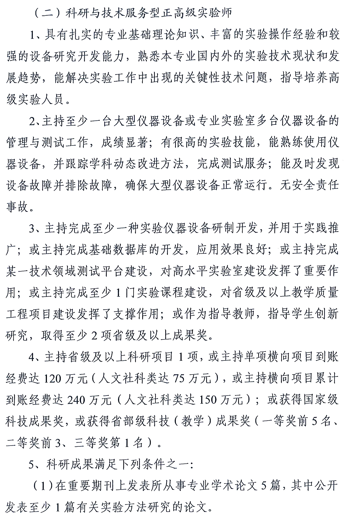 (一)申报高级实验师职务任职资格者,必须具有较强的工作能力和较为丰富的专业工作经验,能从事本学科较大的实验工作,解决实验工作中出现的重要技术问题,参加实验课题研究与技术开发,取得一定社会经济效益的成绩,在实验室建设与管理和实验教学研究方面成绩突出。