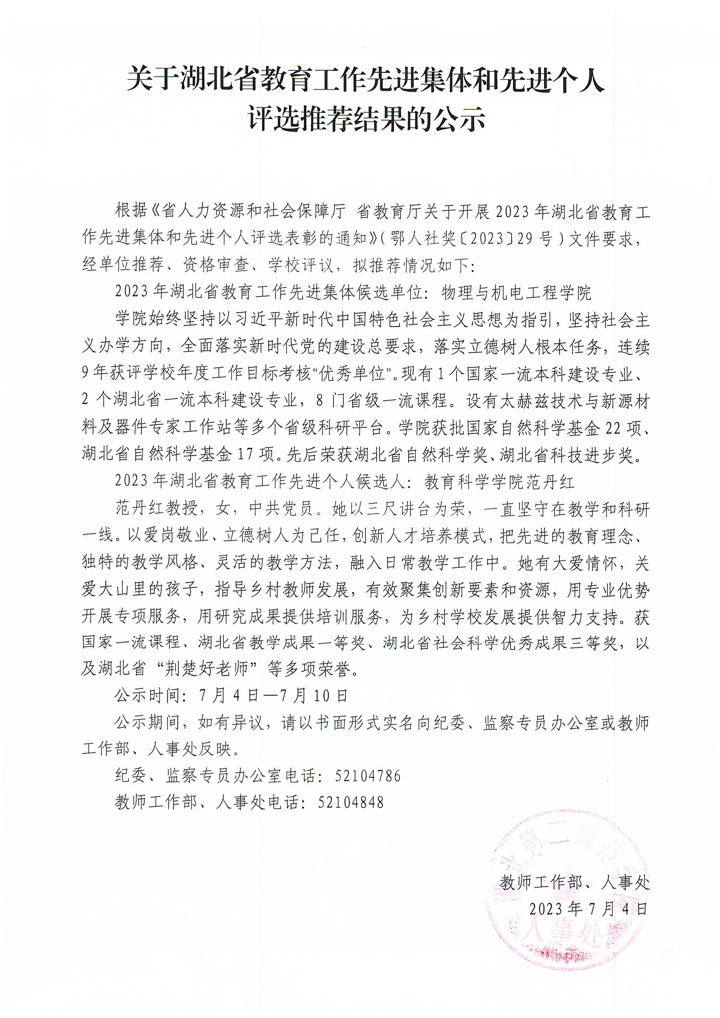 关于湖北省教育工作先进集体和先进个人评选推荐结果的公示